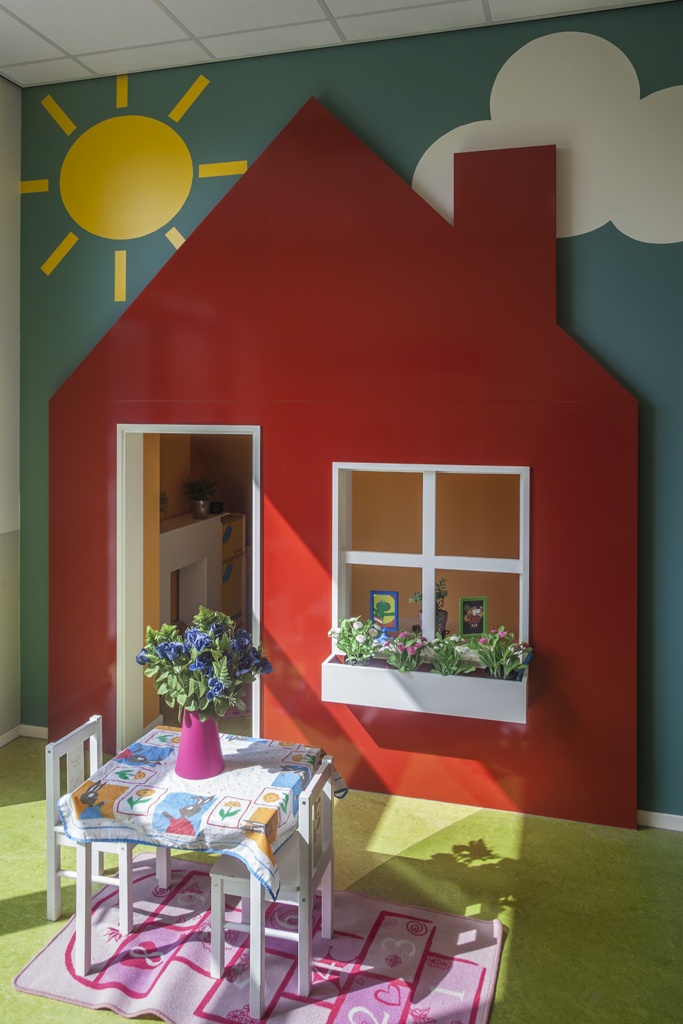 De bouwdelen zijn onderling zo op elkaar betrokken dat, ondanks het aangrenzende oneindige weiland, een geborgen buitenruimte ontstaat voor de allerkleinsten.