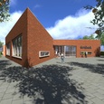 Het hoofdvolume is gemetseld in een rustige donkerpaarse gevelklinker. Door plastische vervormingen in het metselwerk worden de programmatische verschillen prijsgegeven. De flauw hellende kap van het nieuwbouwgedeelte creëert ruimte die nodig is om het gebouw van een moderne installatie te kunnen voorzien.