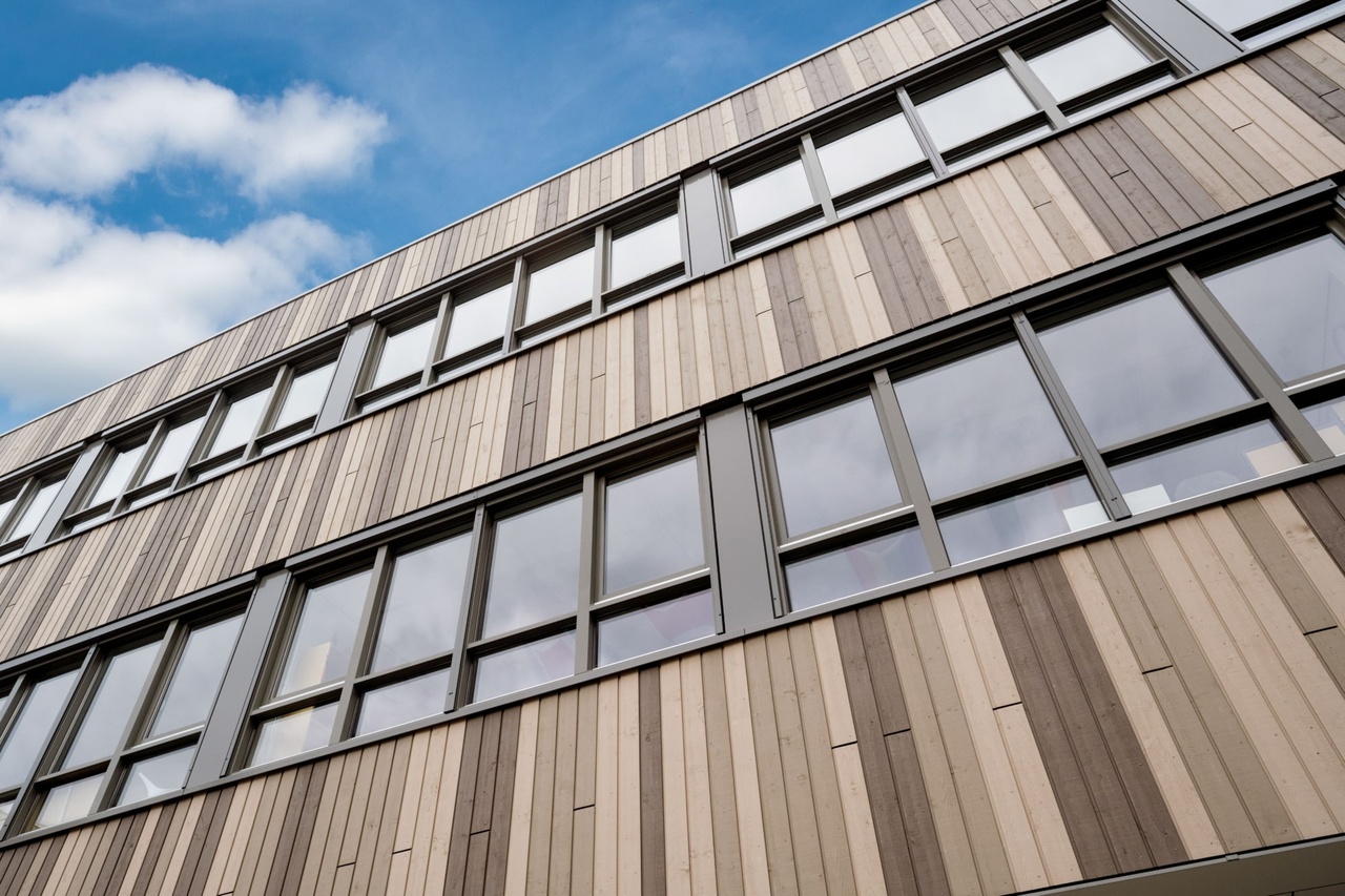 De gevels zijn vanaf de eerste bouwlaag uitgevoerd in gezette, bronskleurige staalplaat met een puntvormige verticale profilering in twee verschillende breedtes. Dit zorgt voor een interessant lijnenspel in de lange en representatieve gevel aan de Karel Doormanlaan. De onderbouw is voorzien van een houten gevelbekleding van Nobelwood en deels uit gemêleerd gevelmetselwerk.