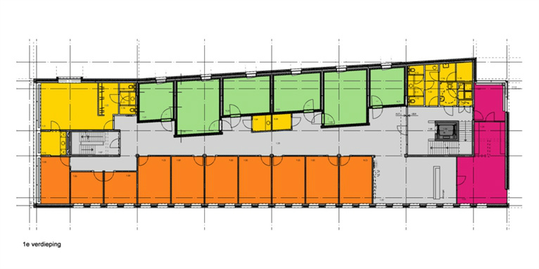 Het plan bevat in totaal 12 studio’s en 2 zorgappartementen en telt drie bouwlagen.De zorgeenheden zijn bestemd voor de doelgroep licht verstandelijke gehandicapten die getraind worden om zelfstandig te gaan wonen.De bewoners zijn overdag in principe naar hun werk dan wel naar de dagbesteding.
