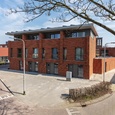 Roodbruin metselwerk, paarsbruine leien als gevelbekleding en een sterke verticale geleding zorgen dat het gebouw goed past bij de sfeer in de binnenstad.