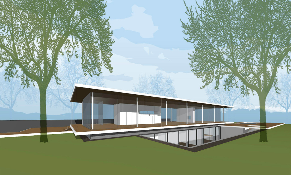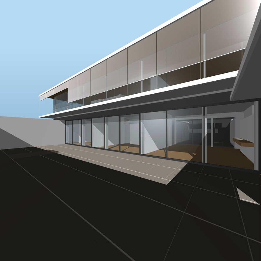 Een langwerpige transparante omhulling is gevangen tussen twee doorstekende vloerplaten en staat rondom vrij op het kavel. De woning toont zich boven het maaiveld als een eenvoudig glazen volume. Dit eenlaagse volume biedt vanaf de straat maximaal doorzicht naar het achtergelegen gebied.