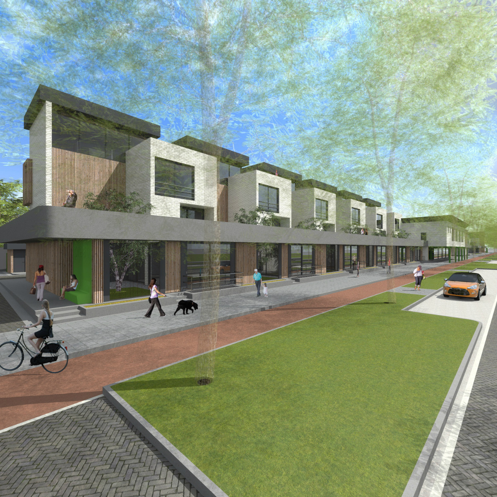 De bomenweide aan de Oostzijde van het pan is met doorsteken verbonden met de achterliggende parkeerstraat. De architectuur van de geschakelde werkwoningen biedt erg veel ruimte voor nadere invulling van gebruikerswensen.